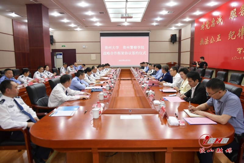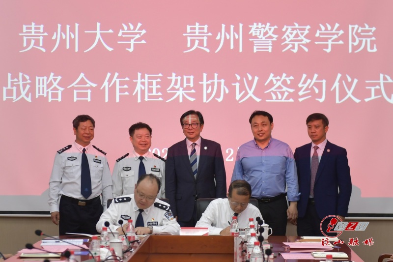 6月2日上午,贵州大学-贵州警察学院战略合作签约仪式在贵州警察学院南区警训楼本科内涵工作室举行。省公安厅党委委员、政治部主任张二宏,省教育厅高等教育处处长李晓飞,贵州警察学院党委书记赵福全,党委副书记、院长吴一文,我校党委书记李建军,副校长李军旗、张大林出席仪式。